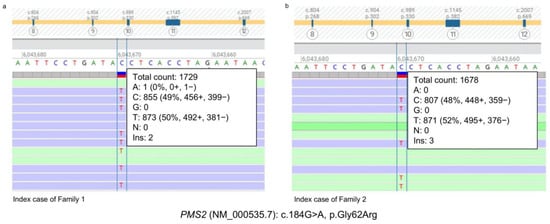 (a,b) Identification of the PMS2 c.184G>A (p.Gly62Arg) variant. Next-generation sequencing results showing the PMS2 c.184 G>A variant in the index case of Family 1 (a) and in the index case of Family 2 (b).
