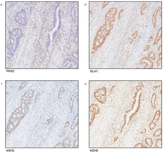 To elucidate whether the observed microsatellite instability phenotype was correlated with MMR protein expression, we performed an immunohistochemical analysis of four MMR proteins (MLH1, PMS2, MSH2, and MSH6) on the colon adenocarcinoma tissue specimen from the index case of Family 1. This analysis revealed a lack of expression of the PMS2 protein (Figure 3a), while MLH1, MSH2, and MSH6 showed normal immunoreactivity (Figure 3b–d). These data strongly suggest that PMS2 protein loss was due to the identified PMS2 germline genetic variant.