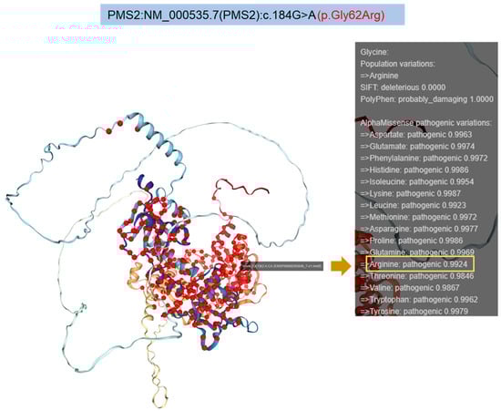 AlphaMissense is an AI model based on the AlphaFold (AF) protein folding algorithm. It leverages structural context and evolutionary conservation data to assess the pathogenicity of missense variants. In particular, AlphaMissense evaluates the pathogenicity of a missense variant as a scalar value ranging from 0 to 1, indicating the likelihood that a given missense mutation is pathogenic [26]. This tool assigned a highly pathogenic score to several Gly62 amino acid substitutions, including the Gly62Arg missense variant (pathogenic score = 0.9924), highlighting the structural relevance of Gly62 for PMS2 stability (Figure 5).