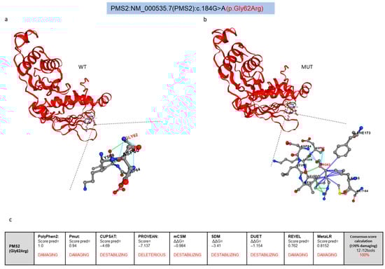Based on the “coincidence rule” criterion, we used a consensus-based approach for our meta-analysis, whereby a variant can be considered potentially pathogenic or destabilizing only if at least 70% of the tools agree on a predicted damaging effect [38]. Since a damaging effect was predicted by all of the tools used in this meta-analysis, the PMS2 Gly62Arg variant can be considered likely damaging (Figure 6c and Supplementary Figure S3a,b).