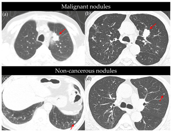 Representative axial CT images of cancerous (a,b) and non-cancerous (c,d) pulmonary nodules identified through low-dose CT screening. (a) Approximately 3 cm mass in the paramediastinal area of the left upper lobe (LUL) anterior segment (red arrow), diagnosed as adenocarcinoma. (b) A 2.4 cm sized nodular opacity in the LUL (red arrow), pathologically confirmed as squamous cell carcinoma. (c) An 8 mm sized nodule in the left lower lobe (LLL) (red arrow), with no significant size change over three serial follow-up CTs; no cancer diagnosis over a 10-year observation period. (d) A 6 mm nodule in the LUL (red arrow) followed-up with two additional CTs; remained stable, with no lung cancer diagnosis over an 8-year follow-up period.