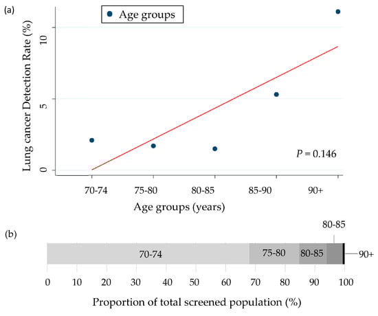Among the 1409 participants who underwent baseline LDCT screening, 31 (2.2%) were diagnosed with lung cancer (Table 3). The detection increased with age from 1.7% in those aged 75–79 to 11.1% in those aged 90 and above, although this trend was not statistically significant (p = 0.146) (Table 3, Figure 3).