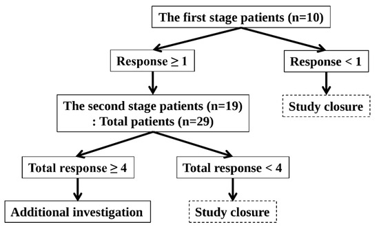 This study was conducted in accordance with the following principles. In the first stage, 10 patients were enrolled. The study was terminated if no patient demonstrated a response. The study proceeded to the second stage if more than one patient responded. In the second stage, an additional 19 patients were enrolled, bringing the total to 29 patients. The study was terminated if fewer than four patients showed a response. If four or more patients responded, the study was considered successful, and the null hypothesis was rejected. Hence, further investigation was warranted.