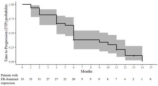 Kaplan–Meier estimate of the time to progression (TTP) probability in patients with ER-dominant expression. The solid line denotes the estimated probability of remaining progression-free, and the shaded band represents the 95% CIs. The tick marks indicate censored observations. The numbers at risk are displayed below the x-axis.