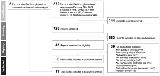 Two reviewers (YYC and TWW) independently searched PubMed, Embase, Web of Science, Cochrane Reviews, and Cochrane Central Register of Controlled Trials. They utilized same pre-defined search strategy: (Advanced cancer OR Metastasis OR Terminal illness) AND (End of life OR Palliative care) AND (Quality of life OR QoL) AND (Physical Activity OR Exercises OR Physical exercise OR Yoga OR Aerobic) AND (Random OR Randomized). This search sought studies for a systematic review and network meta-analysis, from the inception date for each database to 24 February 2024.