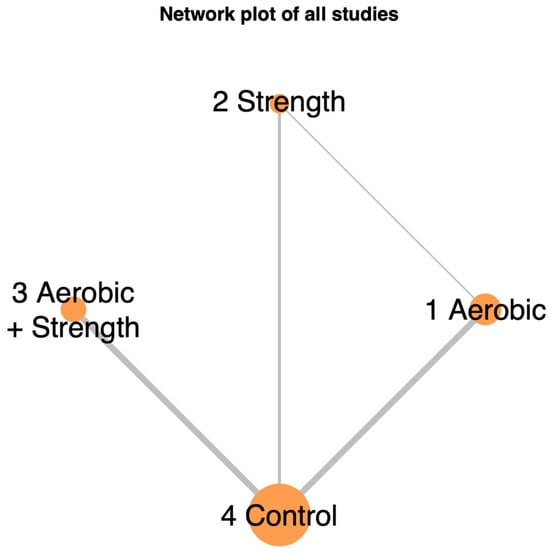 This research uses network meta-analysis (NMA)—a method that enables the simultaneous comparison of multiple interventions—to address the current knowledge gap regarding the efficacy of exercise interventions on quality of life (QoL) in advanced cancer patients []. NMA has the advantage over standard systematic reviews and pairwise meta-analyses in that it allows the comparison of several exercise interventions simultaneously. This approach builds a full network of evidence, including direct comparisons among interventions and indirect comparisons across the studies. This systematic review and network meta-analysis aimed to identify the most effective exercise modalities for improving quality of life (QoL) in patients with advanced-stage cancer. Critically, no prior synthesis has ranked exercise interventions across different cancer types within this population. By mapping the full intervention network, this study provides a comparative analysis of aerobic, strength, and combined exercise strategies to inform evidence-based recommendations for supportive cancer care.