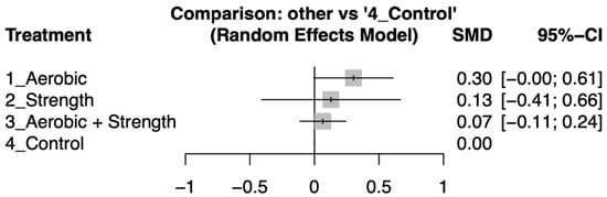 Aerobic training showed a modest improvement in quality-of-life metrics, with an effect size of 0.3 (95% Confidence Interval [CI]: −0.00 to 0.61), suggesting a potential but uncertain benefit. Strength training alone yielded a small effect size of 0.13 (95% CI: −0.41 to 0.66), indicating a slight, albeit statistically insignificant, improvement. The combination of aerobic and strength training resulted in an effect size of 0.07 (95% CI: −0.11 to 0.24), and strength training alone had an effect size of 0.19 (95% CI: −1.08 to 1.46). Neither combination nor isolated strength training significantly differed from the control group, as depicted in Figure 3. For a detailed analysis of the comparisons between study groups, refer to Figure S2.