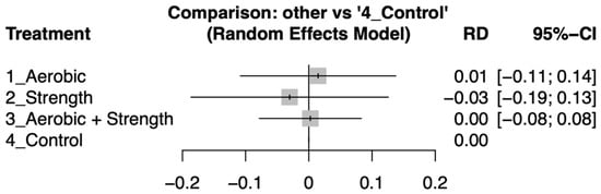 Dropout rates across the various exercise modalities were similar to those in the control groups, as indicated by risk differences with 95% confidence intervals that included zero (Figure 4). Detailed pairwise comparisons of dropout rates between intervention arms are provided in Supplementary Figure S3.