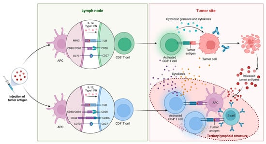 Mechanistic basis for vaccine-based immunotherapy. Following tumor antigen injection, APCs capture, process, and present the antigens on MHC molecules in lymph nodes, activating naïve CD8+ and CD4+ T cells. T cell activation is mediated through the TCR recognition of peptide-MHC complexes and costimulatory interactions (CD28-CD80/CD86, CD27-CD70, and CD40L-CD40), and it is supported by cytokines such as IL-12 and type I interferons (IFNs). Activated CD8+ T cells migrate to the tumor site, where they recognize antigen-expressing tumor cells and exert cytotoxic effects through the release of granules and proinflammatory cytokines, resulting in tumor cell lysis and the release of additional tumor antigens. This antigen release may support epitope spreading and the development of tertiary lymphoid structures (TLSs) within the tumor microenvironment that maintain tumor immunity through tumor eradication. Created in BioRender.