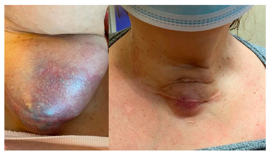 A notable reduction in the neck mass and skin tension in a patient (Case 8) after two months of lenvatinib therapy at 4 mg. Minimal fistula formation with emission of serous secretion occurred and lasted a few days. The Tg value was 19.54 ng/mL at baseline and 5.37 after two months.