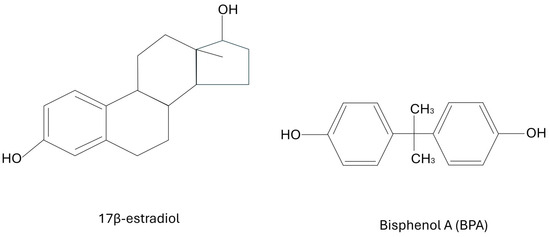 Bisphenol A (BPA) is an extremely common plastic that has recently been found to be an endocrine disrupting compound (EDC) that mimics estrogen. It has been used as an epoxy resin for several decades. Unfortunately, some of this polymer tends to leak its monomers into the surrounding environment. Its main use has been in commercially available products for consumers including food packaging, the lining inside of beverages and canned foods, baby formula packaging, baby bottles, and household food containers. It is also often used in dental prosthetics, and was commonly found in thermal paper such as sales receipts, although this has mainly been banned nowadays [1,2]. In December of 2024, the European Union banned the use of BPA in food contact materials. However, this particular EDC has been found in blood and urine samples of people across the entire globe; whether they live in rural developing regions or in highly advanced developed areas. The health effects range from abnormal childhood development to reproductive problems and cancers in adults [3]. Most typically, bisphenol binds to nuclear- and membrane-bound estrogen receptors (ERs), including G-protein coupled estrogen receptors (GPERs) that are often on the cell surface, as well as with estrogen receptors, known as ERα and ERβ, that are often found in the nucleus. BPA can bind to ERα and ERβ. Unfortunately, the exact mechanisms of which estrogen receptors are involved and exactly how they trigger certain pathways, such as inflammation, are not yet fully understood. Meanwhile, BPA could perhaps also interact with several other endocrine pathways. For example, there is a suspicion of BPA disrupting androgen receptors, thyroid hormone receptors, and other endocrine signaling pathways. There have been quite a few studies showing that this xenoestrogen may have significant effects at nanogram concentrations due to the disruption of normal hormonal signaling pathways [4]. In fact, studies have shown that BPA levels in urine vary from 0.36 to 2.07 μg/L and from 0.5 to 2.0 μg/L within blood samples [3,4]. Since BPA mimics estrogen, it has been theorized for at least a decade that it may be correlated with breast cancers. The key is the structural similarity between BPA and naturally occurring 17β-estradiol. Under natural conditions, the very potent form of estrogen (known as 17β-estradiol) is not always present, but is produced as needed for specific endocrine signaling. In the presence of chronic BPA exposure, the ERs, including GPERs, are continually activated since the receptors are binding BPA. Even when the estrogen receptors should be inactive, they are activated by the structural similarity of BPA to 17β-estradiol, which then causes disruption in endocrine signaling and the activation of subsequent inflammatory pathways. BPA shares a similar chemical backbone with 17β-estradiol, enabling it to mimic or interfere with natural estrogenic activity in the body. The structures of BPA and 17β-estradiol are shown below in Figure 1.