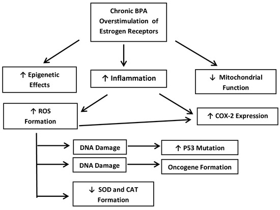 One of the main themes in the literature is that BPA initiates an inflammatory response as the xenoestrogen chronically overstimulates the ERs. The inflammatory response itself has been linked via multiple pathways to oxidative stress and the formation of ROS [20,24]. The inflammatory response itself may upregulate the COX-2 pathway as mentioned above, but the ROS may also directly damage DNA and lead to proto-oncogene mutations and subsequent oncogene formation; thus, creating BCCs [25]. The COX-2 pathway would then become involved as described above and lead to an invasive form of breast cancer via EMT.