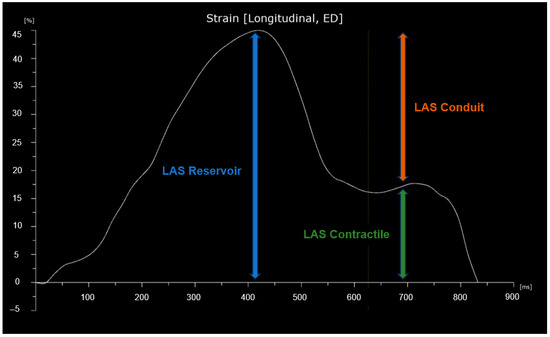Left atrial strain was evaluated using apical four-chamber views obtained with speckle tracking echocardiography (STE). The images were optimized for orientation, depth, and gain to prevent foreshortening of the LA and to visualize the entire LA throughout the cardiac cycle. The recordings were analyzed using specialized software (Automated Cardiac Motion Quantification, QLAB Cardiac Analysis, Philips, Andover, MA, USA) enabling offline semi-automated evaluation of speckle-based strain. The tracking was manually adjusted by the operator when necessary, excluding the LA appendage and the pulmonary vein openings [20]. Left atrial strain was measured in accordance with EACVI recommendations, using the onset of the QRS complex on the ECG as the temporal reference point [20,21]. LAS reservoir (LAS-r) was derived from the strain curve as the peak value, LAS contractile (LAS-ct) as the strain value at the onset of atrial contraction, and LAS conduit (LAS-cd) as the difference between LAS-r and LAS-ct. A graphical representation of LAS is shown in Figure 2.