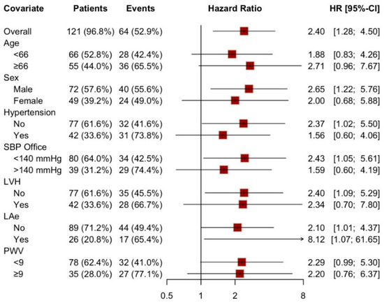 Forest plot: LAS-cd > −22% as a predictive factor in different sub-population. SBP: systolic blood pressure, LVH: left ventricular hypertrophy, LAe: left atrial enlargement, PWV: pulse wave velocity.