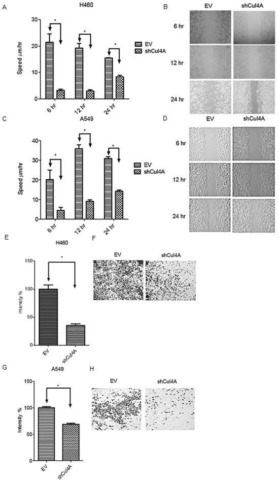 Cul4A knockdown represses metastasis and invasion in lung cancer cells. (A,B) Cell migration assay of H460 lung cancer cells. (C,D) Cell migration assay of A549 lung cancer cells. Cell migration was observed at the indicated time points. (E,F) Cell invasion assay of H460 lung cancer cells. (G,H) Cell invasion assay of A549 lung cancer cells. Cell invasion was observed after 48 h. H460 and A549 lung cancer cells were transfected with empty vector (EV) and Cul4A shRNA (shCul4A). Experiments were performed in triplicate. Data points represent the average migration speed or cell intensity ± standard deviation. * denotes p < 0.05. hr: hours. Original magnification, 100×.
