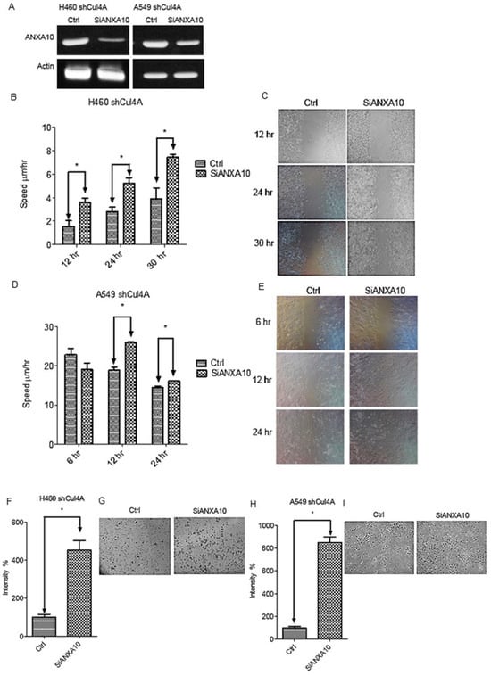 ANXA10 knockdown restores cell migration and invasion in Cul4A knockdown cells. (A) RT-PCR of ANXA10 in H460 (H460 shCul4A) and A549 (A549 shCul4A) Cul4A shRNA transfected stable lung cancer cells or transfected with control siRNA (ctrl) and ANXA10 siRNA (siANXA10). (B,C) Cell migration assay of H460 shCul4A stable lung cancer cells. (D,E) Cell migration assay of A549 shCul4A stable lung cancer cells. (F,G) Cell invasion assay of H460 shCul4A stable lung cancer cells. (H,I) Cell migration assay of A549 shCul4A stable lung cancer cells. Experiments were performed in triplicate. Data points represent the average migration speed or cell intensity ± standard deviation. * denotes p < 0.05. hr: hours.