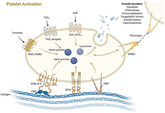 - Smith, C.W. Release of α-granule contents during platelet activation. Platelets 2022, 33, 491–502. [Google Scholar] [CrossRef] [PubMed]