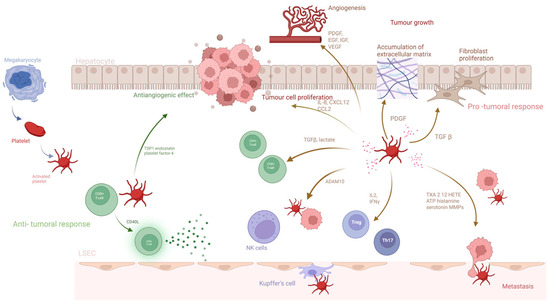 A growing body of evidence has emerged supporting the role of platelets not only in physiological and regenerative processes in the liver but also in mechanisms of proliferation and remodeling associated with neoplasia and HCC pathogenesis. As an active element of the TME, platelets release mediators that are key to creating an inflammatory environment. They also participate in various intercellular interactions between tumor cells and elements of the immune system or other stromal cells via surface receptors. PLTs release mediators, including VEGF, TGFβ1, PDGF, serotonin, interleukins, and chemokines, which induce a proliferative effect by suppressing specific genes or activating transcription factors. Platelets may also contribute to the formation of metastases due to the large amount of angiogenic factors present in their intracellular vesicles, released upon their activation, and the remodeling of the environment.