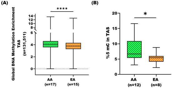 Global DNA methylation analysis in tumor-adjacent stroma of African American and European American prostate cancer patients. (A) Box plot comparisons of global DNA methylation based on MBD-seq data in TAS of AA (n = 17) and EA (n = 15) PCa patients. The average methylation enrichment across 131511 regions was compared between cohorts. AA patients exhibited significantly greater global DNA methylation (p-value < 0.001, Mann–Whitney U test). (B) Box plot comparison of global %5-methylcytosine (%5-mC) content in AA and EA TAS using LINE-1 assay. AA TAS exhibited significantly higher levels of 5-methylcytosine (p-value = 0.039, Mann–Whitney U test). * = p-value < 0.05 and **** = p-value < 0.0001.