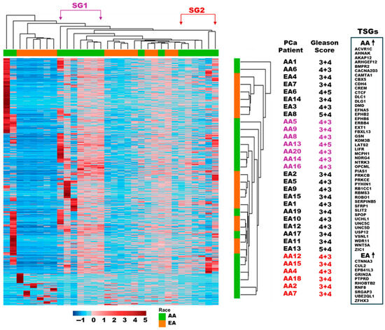 Hierarchical clustering analysis of DNA methylation in tumor-adjacent stroma. The dendrogram on the top and right lists the patient samples from AA (n = 17) and EA (n = 15) cohorts. This illustrates the relatedness of DNA methylation across 1659 statistically significantly differentially methylated regions (p-value < 0.05) that correspond to 1557 protein-coding genes for each patient. Alongside the dendrogram (rotated 90° and enlarged on the right), patients’ ancestry and Gleason score are depicted. On the right side, the tumor suppressor activity of significantly differentially methylated genes is displayed. The list indicates which genes are more methylated in AA and which ones are more methylated in EA PCa patients. The level of DNA methylation is depicted as a color intensity on a z-score scale; (TAS) tumor-adjacent stroma, (AA) African Americans, (EA) European Americans, (SG1) subgroup 1, (SG2) Subgroup 2, and (PCa) prostate cancer.