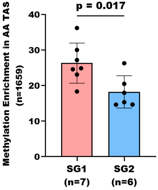 Subcategorization of AA PCa patients is based on stromal DNA methylation levels. The bar graph depicts average methylation enrichment in SG1 (n = 7) and SG2 (n = 6) of AA TAS samples. Analysis covers 1659 statistically significant differentially methylated regions corresponding to 1557 protein-coding genes. Methylation enrichment was significantly different between the two subgroups (p-value < 0.05, Mann–Whitney U test). Each dot represents an individual patient within the subgroup. Of the seven patients in SG1 with greater DNA methylation, six patients had a Gleason score of 4 + 3 or higher. In contrast, two out of six patients in SG2 had a Gleason score of 4 + 3 or higher.