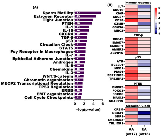 Pathway analysis of significantly methylated genes in AA TAS vs EA TAS. (A) Bar diagrams depicting the selected significant canonical pathways (p-value < 0.05) associated with significant differentially methylated genes showing increased DNA methylation in AA TAS (n = 1379) compared to EA TAS. Pathway analysis was conducted using QIAGEN Ingenuity Pathway Analysis. (B) Heatmap displaying DNA methylation enrichment of selected genes in significant pathways (p-value < 0.05) with increased DNA methylation in AA TAS (n = 17). DNA methylation enrichment values for AA TAS (n = 17) and EA TAS (n = 17) were transformed Log2.