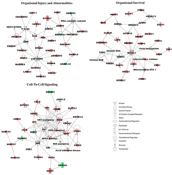 Top three networks associated with significantly differentially methylated genes in TAS of AA vs. EA (i.e., 1557 protein-coding genes). Node shapes are defined in the key to the right of the networks. Red color nodes indicate genes of the network that are more methylated in AA TAS vs. EA TAS. Darker shades of the nodes indicate higher methylation values. Green color nodes represent genes with decreased DNA methylation in AA TAS compared to EA TAS. Solid lines represent direct interactions, while dotted lines represent indirect interactions. White colored nodes are in the network, but not in our dataset. Nodes marked with an asterisk (*) indicate that multiple identifiers in the dataset map to a single gene.