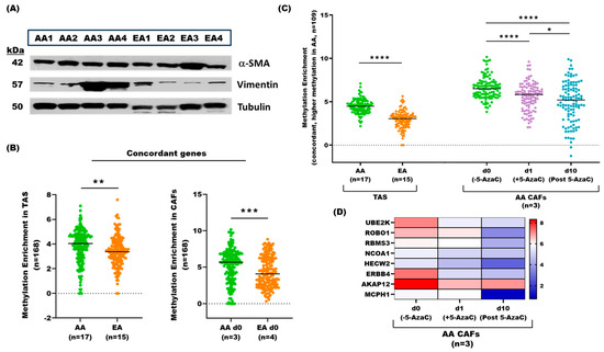 Methylome analysis of patient-derived tumor-adjacent CAF cultures. (A) Western blot analysis of α SMA and vimentin (fibroblast markers) and tubulin (housekeeping gene) in AA (n = 4) and EA (n = 4) CAF primary cultures at passage 6. (The original and uncropped Western images with band quantification are included in the supplementary material file (Supplementary Figure S1C,D). (B) Concordance analysis of statistically significantly differentially methylated genes in AA vs. EA TAS (n = 1885) and AA vs. EA CAFs (n = 3255). Box plots show DNA methylation distribution of 168 concordant methylated genes in AA TAS (n = 17) vs. EA TAS (n = 15) (left panel) and AA CAFs (n = 3) vs EA CAFs (n = 4) (right panel). Average DNA methylation levels differ significantly between AA and EA in both TAS and CAFs (p-value < 0.001 and < 0.01, respectively, according to the Mann–Whitney U test. (C) Methylation status of 109 genes with higher methylation in both AA CAFs and AA TAS at three time points: day 0 (d0; untreated), day 1 (d1; 5-AzaC treatment), and day 10 (d10; post 5-AzaC treatment). Average DNA methylation in AA CAFs (n = 3) decreased significantly at d1 (p-value < 0.0001, Mann–Whitney U test) and further decreased in post d10 (p-value < 0.0001, Mann–Whitney U test) compared to d0. (D) Heatmap depicting average DNA methylation enrichment of key selected concordant genes in AA CAFs (n = 3) across three time points (d0, d1, and d10). * = p-value < 0.05, ** = p-value < 0.01, *** = p-value < 0.001, and **** = p-value < 0.0001. Note: one AA CAF is excluded from the analysis due to insufficient sequencing reads.