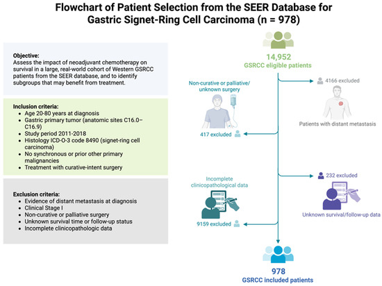 - Schiefer, S.; Crnovrsanin, N.; Kalkum, E.; Vey, J.A.; Nienhüser, H.; Rompen, I.F.; Haag, G.M.; Müller-Stich, B.; Billmann, F.; Schmidt, T.; et al. Is Neoadjuvant Chemotherapy Followed by Surgery the Appropriate Treatment for Esophagogastric Signet Ring Cell Carcinomas? A Systematic Review and Meta-Analysis. Front. Surg. 2024, 11, 1382039. [Google Scholar] [CrossRef] [PubMed]
