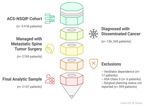 Patient inclusion flowchart for 2147 patients managed with metastatic spine tumor surgery for disseminated cancer extracted from ACS-NSQIP 2018–2023 database (this figure was developed using the Napkin AI web application [Corresponding website address: https://www.napkin.ai/] [Accessed date: 8 May 2025]).