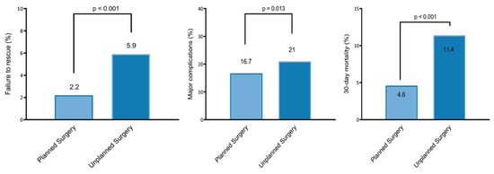 Exploratory data analysis was first performed. The categorical variables were expressed as percentages of the total and continuous variables were expressed as mean (with standard deviation). Categorical variables among unplanned and planned surgery cohorts were compared via Pearson’s chi-square test of association, whereas the independent-sample t-test was implemented to compare continuous variables among cohorts. Univariable regression analyses were undertaken to explore the association of each independent variable with primary and secondary endpoints. The primary independent variable was planned (elective) vs. unplanned (urgent or emergent) surgery. Multivariable regression analyses were undertaken to determine the independent predictors of primary and secondary endpoints. Only factors with a p-value < 0.05 in univariable analysis were included in the multivariable regression analyses to reduce the likelihood of overfitting given the relatively low number of events. Statistical analyses were performed using IBM SPSS (version 26), Stata/IC (version 15), and GraphPad Prism (version 10). Statistical significance was defined as a p-value < 0.05.