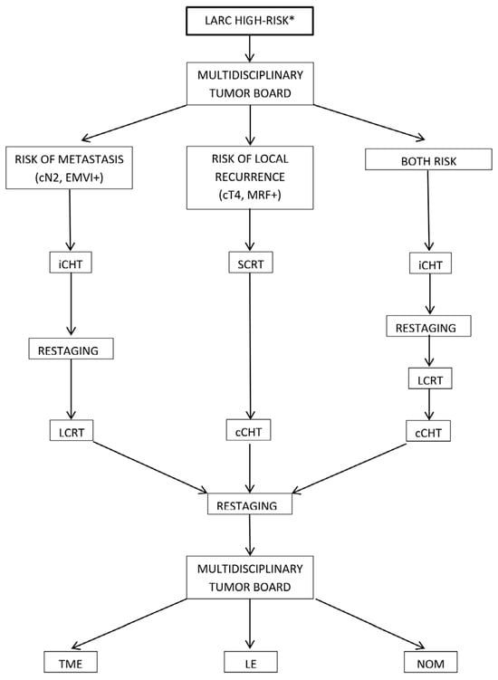 Decision-making algorithm for total neoadjuvant therapy (TNT) sequencing and patient management. * cT4, cN2, EMVI, tumor deposits, MRF involvement, and a threatened intersphincteric plane. cCHT: consolidation chemotherapy, iCHT: induction chemotherapy, LARC: locally advanced rectal cancer, LCRT: long-course CRT, LE: local excision, MRF: mesorectal fascia, NOM: non-operative management, SCRT: short-course radiotherapy, TME: total mesorectal excision.