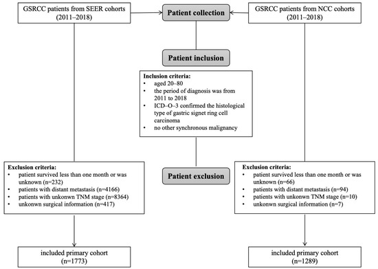 Patients diagnosed with GSRCC between 2011 and 2018 were identified from the Surveillance, Epidemiology, and End Results (SEER) database (SEER*Stat v8.4.2) and the National Cancer Center (NCC) database. The inclusion criteria were as follows: (1) histology code 8490 (ICD-O-3), (2) primary tumor site (C16.0–C16.9), (3) no synchronous malignancies, (4) age between 20 and 80 years, and (5) receipt of radical surgery. Exclusion criteria included the following: (1) non-radical surgery, (2) unknown survival status, (3) distant metastasis, and (4) incomplete clinicopathological data (e.g., undetermined TNM stage). The screening process is outlined in Figure 1. Ethical approval for this study was granted by the Ethics Committee of the National Cancer Center, Chinese Academy of Medical Sciences (Approval No. 23/238-3980). Informed consent was waived due to the retrospective design of the study.