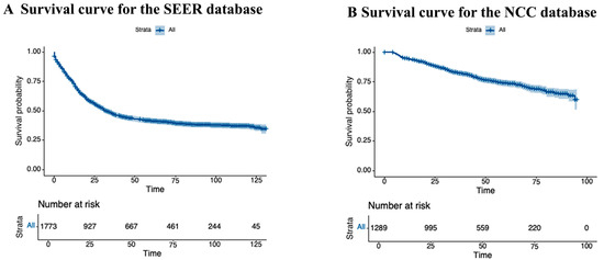 Overall survival of the entire cohort. (A) SEER database; (B) NCC database.