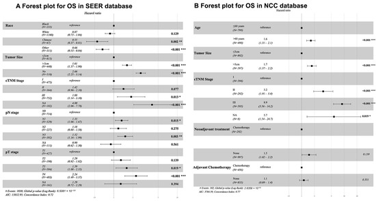 Univariate analysis revealed several factors associated with poor prognosis in the SEER cohort, including race, tumor size, cTNM stage, pT, and pN stage (Table 4). In the NCC cohort, significant prognostic factors included age, tumor size, cTNM stage, NAC, and adjuvant chemotherapy. Multivariate analysis confirmed these factors as independent predictors of survival in SEER (all p < 0.05; Figure 4), while in the NCC cohort, age, tumor size, and cTNM stage remained significant (p < 0.05). NAC did not show a significant OS benefit in either cohort (SEER: p = 0.653; NCC: p = 0.139).