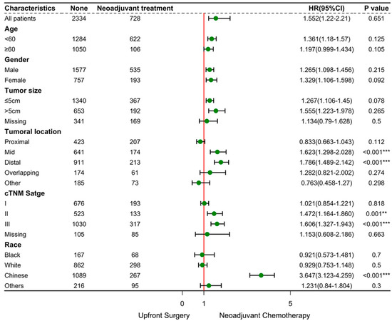 Patients were followed-up at regular intervals, as follows: every 3 months for the first 2 years and biannually thereafter until 5 years post-surgery. Follow-up evaluations included tumor marker testing, chest-abdominal-pelvic CT scans, and annual endoscopic examinations. The primary endpoint of the study was OS, defined as the time from treatment initiation to death or last follow-up. The frequency of missing data for patient-, tumor-, and treatment-related variables was also recorded. Continuous variables were expressed as the mean ± standard deviation and were analyzed by a t-test for continuous variables. Categorical variables were displayed as counts and percentages, and they were analyzed using χ2 tests or Fisher’s exact tests. Survival analysis was performed using Kaplan–Meier curves and Cox proportional hazards models (both univariate and multivariate). Subgroup comparisons between the NAC and surgery-alone groups were performed, with statistical significance set at p < 0.05 (two-tailed). Censoring occurred for patients who remained alive without relapse at their last follow-up visit. All statistical analyses were conducted using R version 3.5.1. Detailed R package information are showed in Table S4.