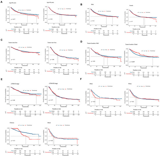 Overall survival curves for GSRCC patients, stratified by clinical factors. (A) Age. (B) Gender. (C) Tumor size. (D) Tumor location. (E) cTNM stage. (F) Race. The number of patients at risk at each interval is shown in the table at the bottom of the graph.