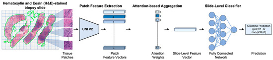 Overview of the pipeline for predicting pathologic complete response (pCR) to neoadjuvant chemotherapy (NACT) in triple-negative breast cancer (TNBC) using pre-treatment H&E-stained biopsy slides. First, the H&E-stained slide is segmented and divided into a grid to extract tissue patches. Each patch is then encoded into a feature vector using a pretrained deep learning encoder (i.e., UNI v2 [46], a general-purpose, self-supervised pathology foundation model trained on 1.2 million histopathology slides). These patch-level features are aggregated via an attention mechanism [45] that assigns greater weight to the most informative regions, resulting in a slide-level feature representation. A fully connected neural network classifier then utilizes the slide-level feature representation to predict the likelihood of a complete response (pCR) or non-response (non-pCR) to NACT for each patient.