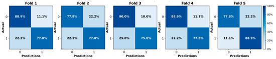 Confusion matrices illustrating the model’s performance on each test fold of the in-house cohort using five-fold cross-validation.