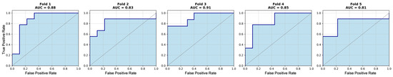 Receiver operating characteristic (ROC) curves for each test fold of the in-house cohort using five-fold cross-validation. Area under the curve (AUC) values range from 0.81 to 0.91.