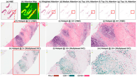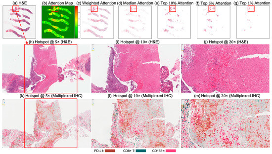 Attention map visualization of an attention-based multiple instance learning (MIL) model for a correctly classified triple-negative breast cancer (TNBC) patient (true negative) who did not achieve pathological complete response (non-pCR) to neoadjuvant chemotherapy (NACT). (a) H&E-stained biopsy slide thumbnail with (b) corresponding attention heatmap generated by the MIL model. (c) Weighted attention representation showing individual patches weighted by the model’s attention scores. (d) Median attention. (e–g) Progressive filtering of attention regions showing median attention: (e) top 10% attention (f) and top 5% attention, (g) culminating in top 1% attention hotspots. (h–j) Zoomed-in H&E slides of the identified hotspot region at increasing magnifications: 5×, 10×, and 20×, respectively. (k–m) Multiplex immunohistochemistry (mIHC) slide of consecutive tissue sections from the same hotspot region at the same magnifications (5×, 10×, 20×), revealing the presence of PD-L1 (brown), CD8+ T cells, and CD163+ macrophages (red) in the model-identified regions. These immune markers are established biomarkers for pCR in TNBC [27], demonstrating the model’s ability to attend to immunologically relevant regions rich in biomarkers.