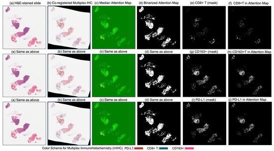 Columns (a) through (d) display (a) the original H&E-stained biopsy slide, (b) the corresponding co-registered multiplex immunohistochemistry (mIHC) slide, (c) the median attention map generated by the attention model, and (d) the binarized version of the attention map. Column (e) shows the CD8+ T-cell mask, and column (f) illustrates the intersection between the binarized attention map (d) and the CD8+ T-cell mask (e), indicating the presence of CD8+ T cells within the model’s attention regions. Similarly, column (g) presents the CD163+ cell mask, and column (h) shows the intersection between (d) and (g), reflecting the attention overlap with CD163+ regions. Column (i) displays the PD-L1 mask, and column (j) presents the intersection between (d) and (i), quantifying the presence of PD-L1 in the attended regions.