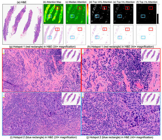 Attention map visualization for an incorrectly classified triple-negative breast cancer (TNBC) patient who achieved pathological complete response (pCR) to neoadjuvant chemotherapy (NACT) but who the model predicted as non-pCR. (a) H&E-stained biopsy slide thumbnail. (b,c) First row: corresponding attention heatmap generated by the deep learning model. The second row displays the weighted attention representation showing individual patches weighted by the model’s attention scores. (c) Median attention. (d–f) display the top 10%, 5%, and 1%, attention masks while below each mask is shown individual patches weighted by the model’s attention scores. (g,h) show the zoomed-in H&E slide of the identified hotspot region 1 (highlighted by the red rectangle) at increasing magnifications of 20×, and 40×, respectively. (i,j) show the zoomed-in H&E slides of the identified hotspot region 2 (highlighted by the blue rectangle) at increasing magnifications of 20×, and 40×, respectively.