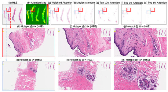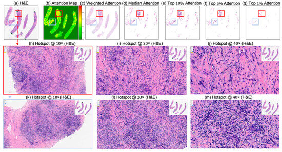 Attention map visualization of an attention-based multiple instance learning (MIL) model for an incorrectly classified TNBC patient (false negative) who achieved pathological complete response (pCR) to neoadjuvant chemotherapy (NACT), but who the model predicted as non-pCR. (a) H&E-stained biopsy slide thumbnail with (b) corresponding attention heatmap of the MIL model. (c) Weighted attention representation showing individual patches weighted by the model’s attention scores. (d) Median attention. (e–g) Progressive filtering of attention regions showing median attention, (e) top 10% attention, (f) and top 5% attention, (g) culminating in top 1% attention hotspots. (h–j) Zoomed-in H&E slide of the identified hotspot region (highlighted by the red rectangle) at increasing magnifications: 8×, 20×, and 40×, respectively. (k–m) Zoomed-in H&E slides of the identified hotspot region (highlighted by the sky-blue rectangle) at increasing magnifications: 8×, 20×, and 40×, respectively.