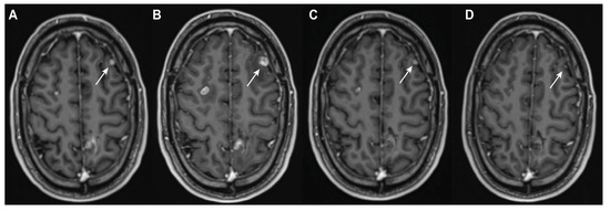 Case of pseudoprogression due to ICI therapy. Post-contrast T1-weighted imaging of a 38-year-old man with melanoma. The patient was treated for approximately four months with combination dabrafenib and trametinib after the diagnosis of diffuse cerebral metastatic disease. The left frontal lesion (white arrow) showed initial evidence of response ((A) nadir scan) and measured 6 × 5 mm in the transverse plane. ICI therapy (combination nivolumab–ipilimumab) was started. Diffuse progression was seen on MRI 7 days after the second dose, with the left frontal lesion increasing in size to 11 × 10 mm ((B) progression scan). A follow up scan 1 month later without any intervening treatment showed a partial response to 5 × 4 mm (C). The next follow-up scan, 4 months after the progression scan, showed a near complete response to 2 × 1 mm, again without any intervening treatment ((D) definitive diagnosis scan).