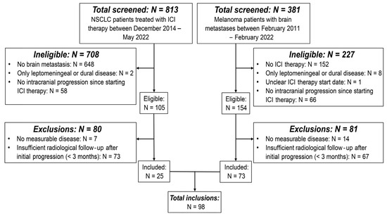 A single-institution retrospective cohort study, approved by the Medical Ethics Committee of the University Medical Center Groningen and registered centrally (9 June 2022; 2022/273; 202200340), was conducted. All screened patients were assessed for whether they had submitted a signed objection to the retrospective use of their data for research purposes. The electronic patient registry was screened using a pre-compiled database of melanoma patients with brain metastases diagnosed initially on either brain CT or MRI and seen as in- or out-patients between February 2011 and February 2022. Due to incompleteness of this database, missing patients were systematically screened with specified search terms using a data exploration tool within the electronic patient registry. Additionally, the electronic patient registry was screened using a pre-compiled database of all NSCLC patients treated with any ICI-containing treatment regimen between December 2014 and May 2022.
