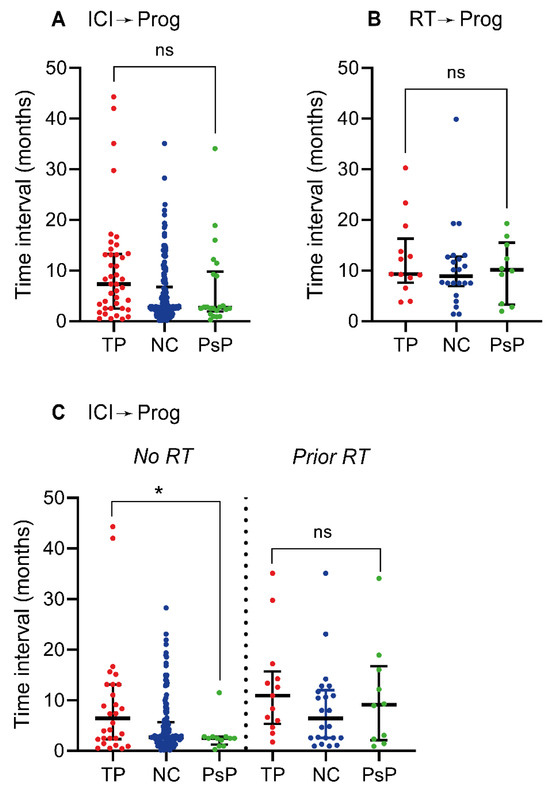 There was no significant difference in the median interval between the start of ICI therapy and the progression scan between the TP (7.4 months, IQR = 2.5–13.3 months) and PsP groups (2.7 months, IQR = 1.9–9.8 months) (p = 0.07) (Figure 3A). The maximum interval observed in the PsP group was 34.1 months. Similarly, there was no significant difference in the median interval between administered radiotherapy and the progression scan between the TP (9.3 months, IQR = 7.6–16.3 months) and PsP groups (10.2 months, IQR = 3.3–15.5) (p = 0.70) (Figure 3B). The median interval between the start of ICI therapy and the progression scan was significantly higher in the TP group (6.4 months, IQR = 2.3–13.1 months) compared to PsP (2.5 months, IQR = 1.2–2.8 months) when analysing lesions without prior radiotherapy (p = 0.04) (Figure 3C). The difference between TP (10.9 months, IQR = 5.3–15.7 months) and PsP (9.1 months, IQR = 2.1–16.8 months) was not significant when only analysing lesions with prior radiotherapy (p = 0.52) (Figure 3C).