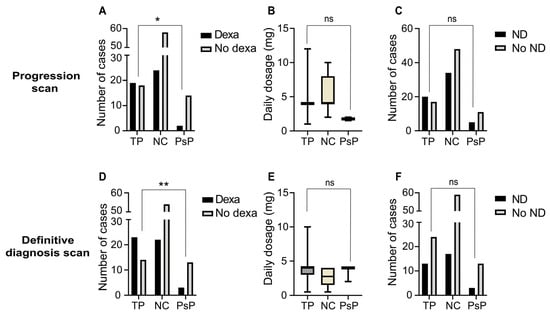 The proportion of patients treated with dexamethasone for neurological symptoms was significantly greater in the TP group at both the progression scan (51.4% TP versus 12.5% PsP) (p = 0.01, OR = 7.4) and the definitive diagnosis scan (62.2% TP versus 18.8% PsP) (p < 0.01, OR = 7.1) (Figure 4A,D). There was no significant difference in either the dexamethasone dose or the proportion of patients with neurological deterioration at both time points between the groups (Figure 4B,C,E,F).