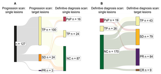 The proportion of pre-existent to de novo lesions was not significantly different between the TP (58.5% pre-existent) and PsP groups (72.7% pre-existent) (p = 0.29, OR = 0.5). Differences in all other characteristics compared at both scan time points were not significantly different apart from the longest lesion diameters at the moment of definitive diagnosis (Table 2). The proportion of cases where disappearance or unequivocal progression of non-target lesions occurred was comparable between the groups at both time points (Supplementary Materials, Figures S1 and S2).