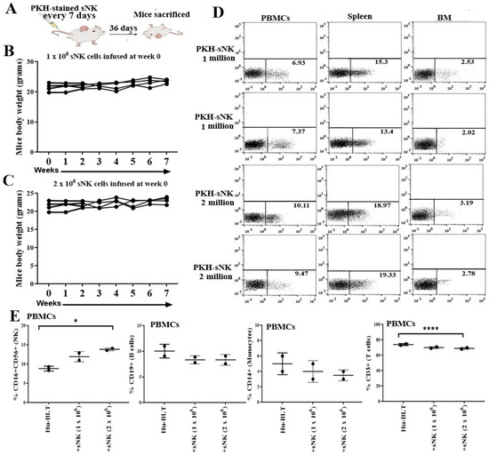 Biodistribution and safety of sNK cells in disease-free hu-BLT mice. Hu-BLT mice were administered PKH sNK cells via the tail vein (1 × 106 and 2 × 106 sNK cells in a total of 4 infusions), and mice were sacrificed 36 days after the first sNK cell infusion (A). The body weight of mice was recorded every week for 7 weeks (n = 4) (B,C). On day 36, mice were sacrificed; peripheral blood-derived PBMCs, splenocytes, and bone marrow cells were analyzed for PKH sNK cells (n = 2) (D); and PBMCs were analyzed for percentages of CD16+CD56+ NK cells, CD19+ B cells, CD14+ monocytes, and CD3+ T cells using flow cytometry (n = 2) (E). **** (p-value < 0.0001), and * (p-value 0.01–0.05).